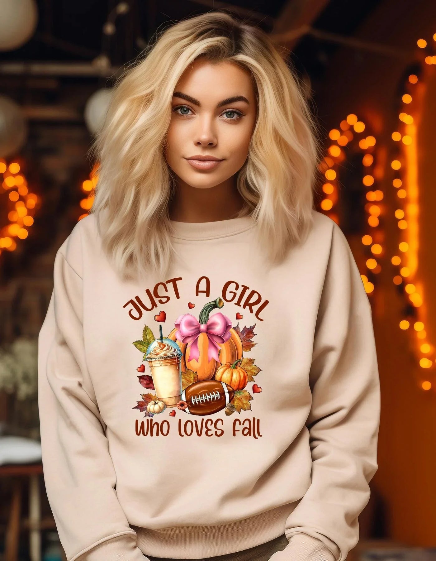 Design: "Just a Girl Who Loves Fall", mit Kürbissen, Latte, Fußball und Herbstblättern