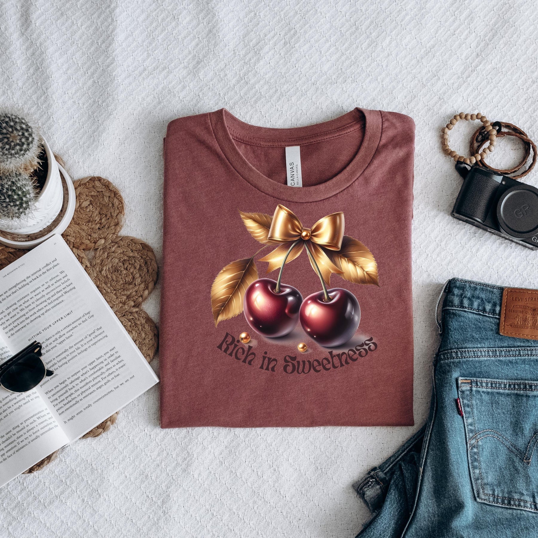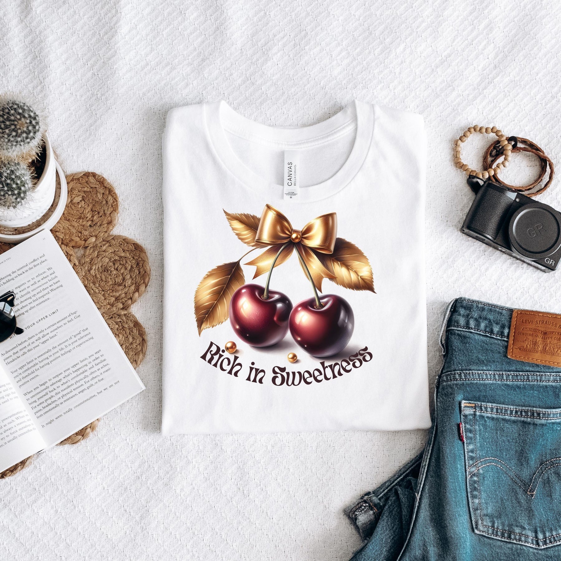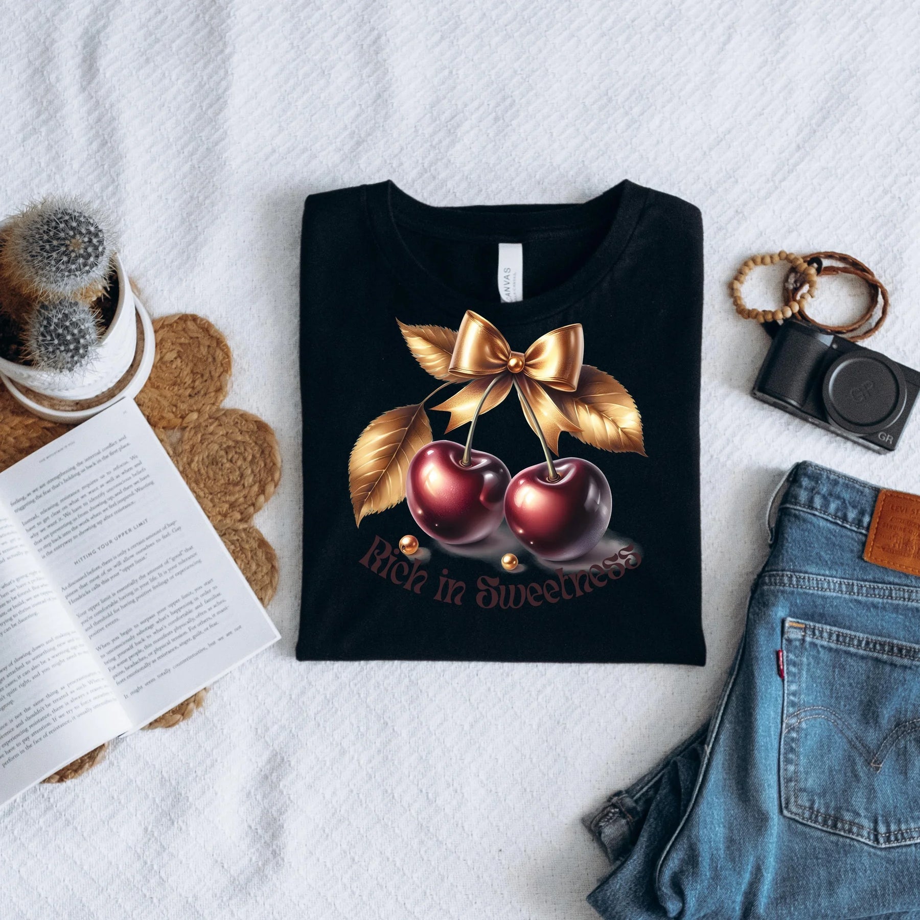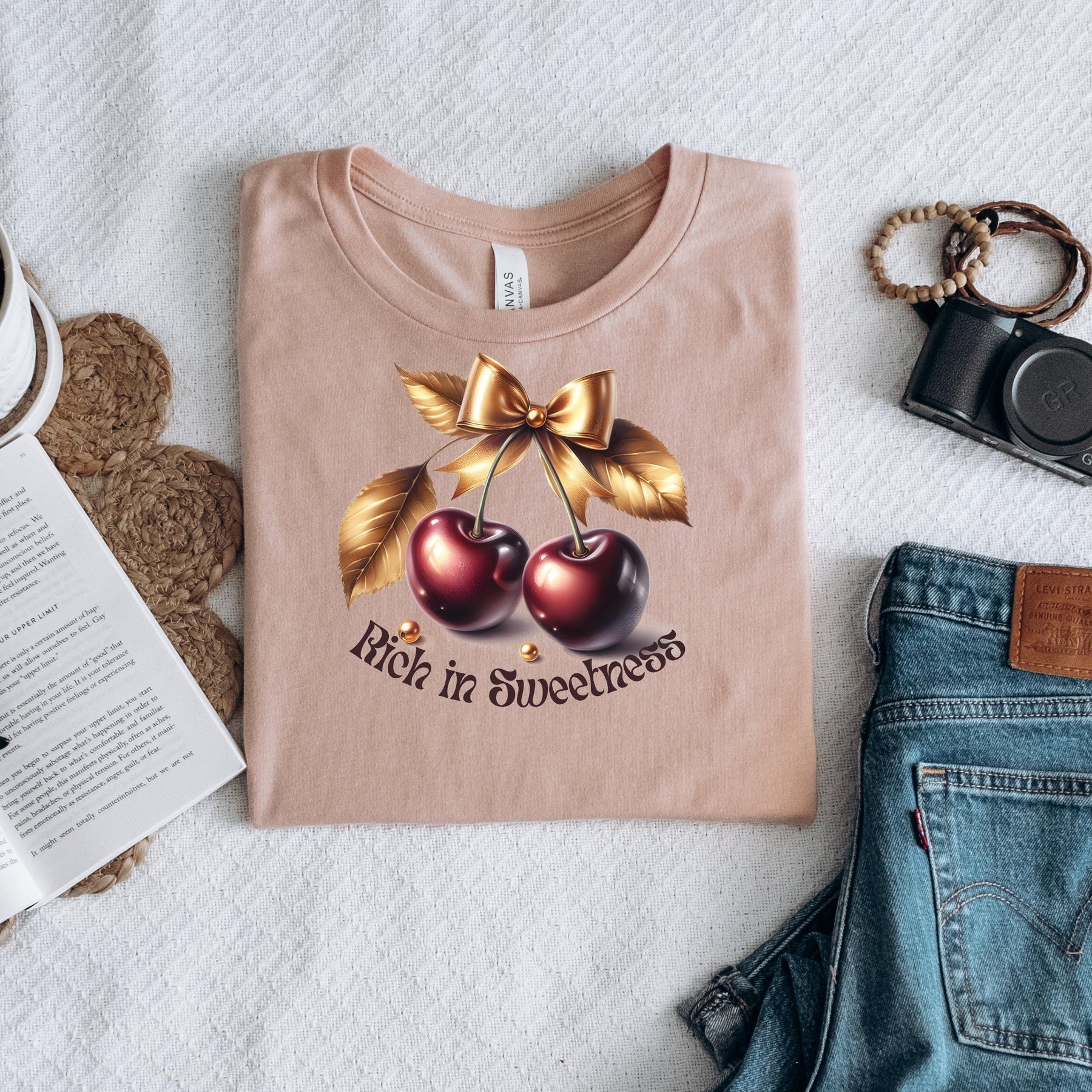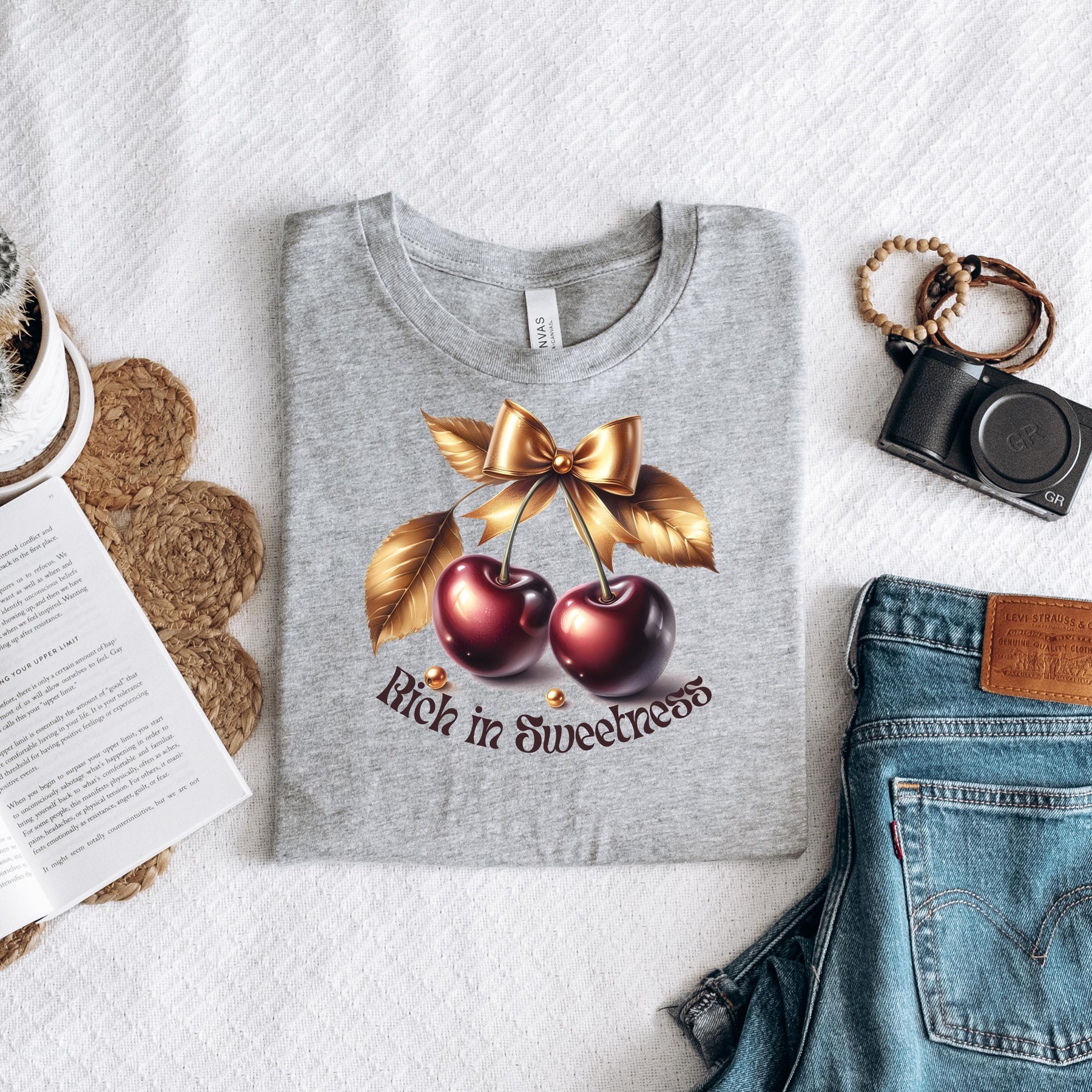Dieses stylische T-Shirt mit glänzenden Kirschen, goldener Schleife und dem Slogan Rich in Sweetness“ ist ein echter Hingucker. Ideal für alle, die ihren Look mit einem femininen, frechen oder vintage-inspirierten Statement abrunden wollen.