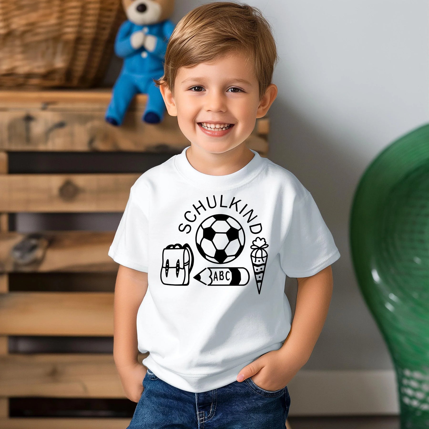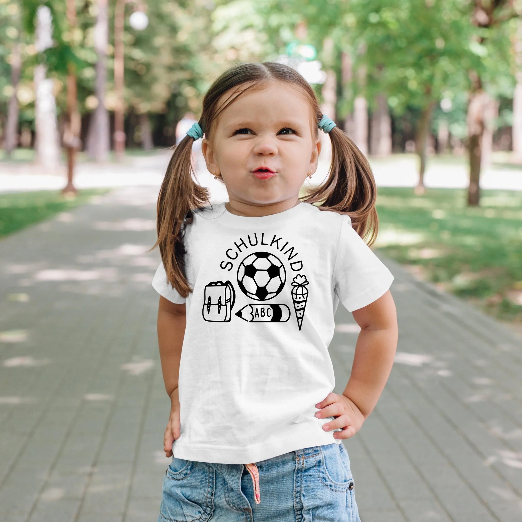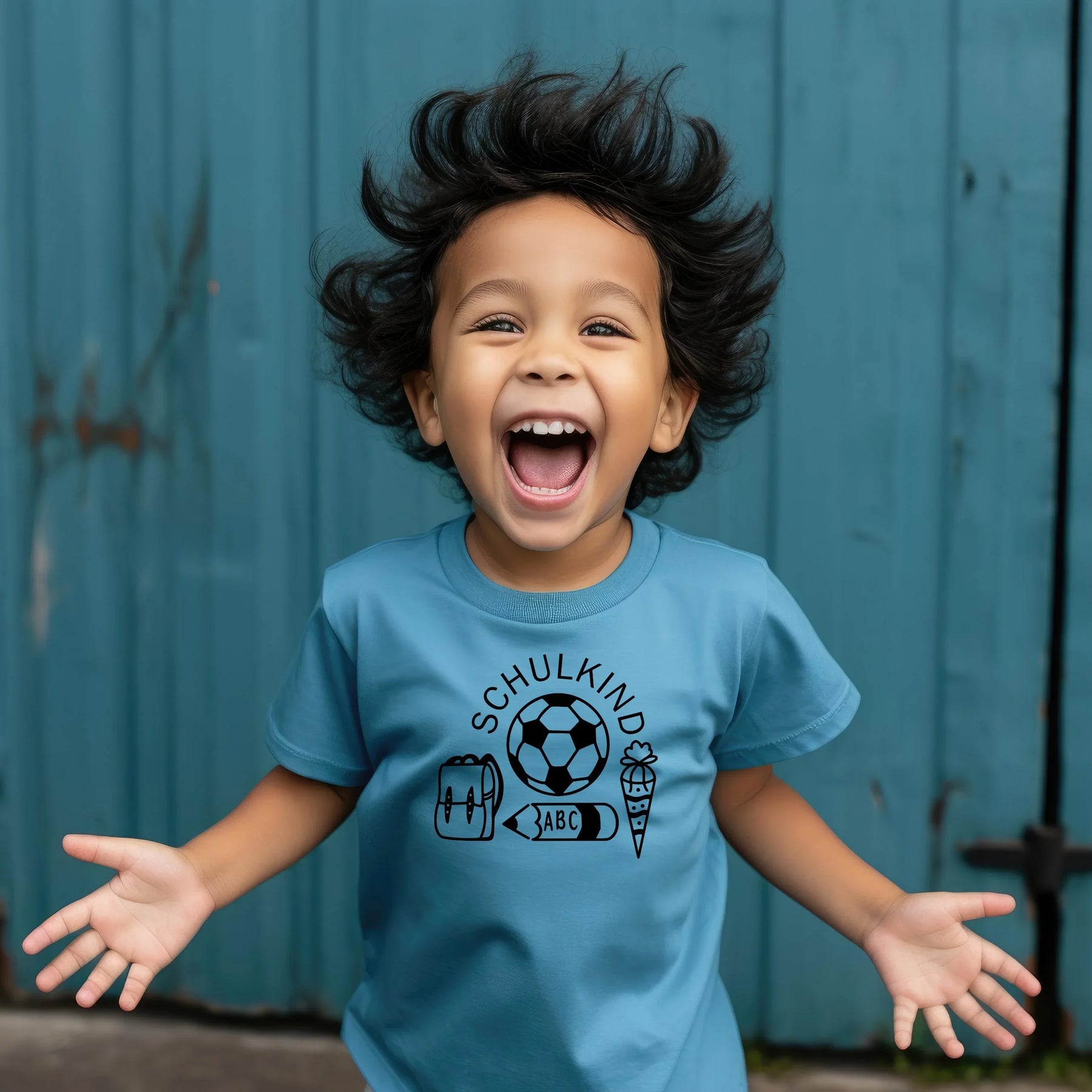 Dieses sportliche Schulkind-Shirt mit Fußball, Schultüte und ABC-Motiv ist ideal für kleine Kicker zum Schulanfang. Perfekt als Geschenk zur Einschulung, für den ersten Schultag oder das Einschulungsfoto!