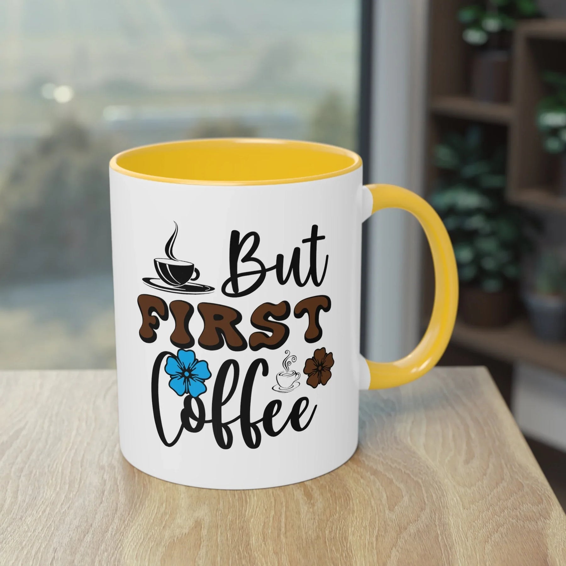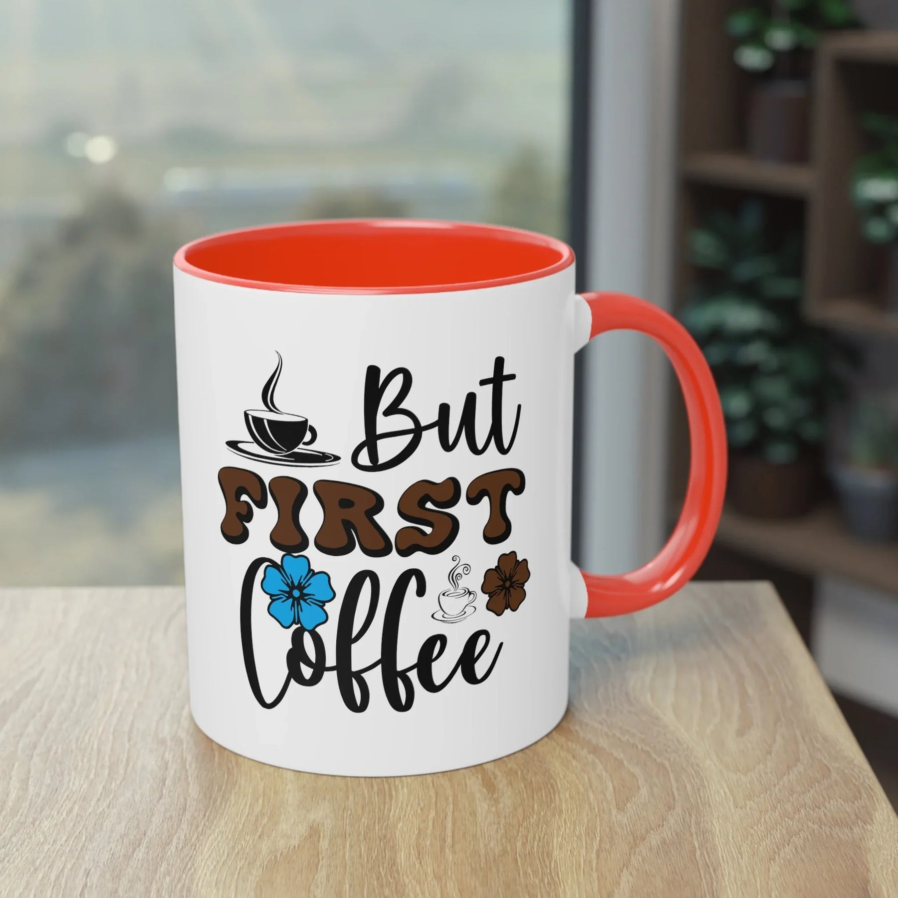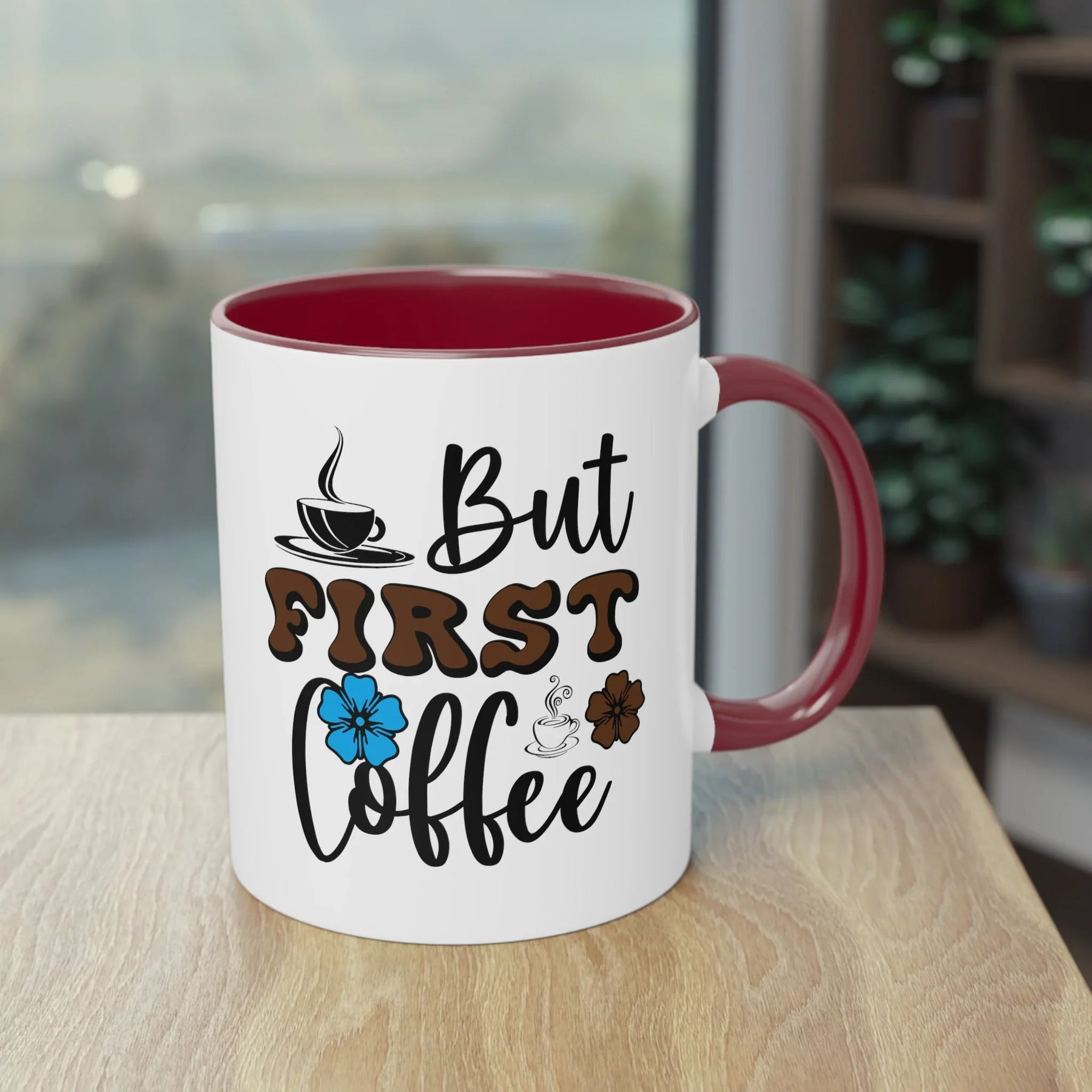 Design: "But First Coffee" Schriftzug mit bunten Blumen und Kaffeetassen