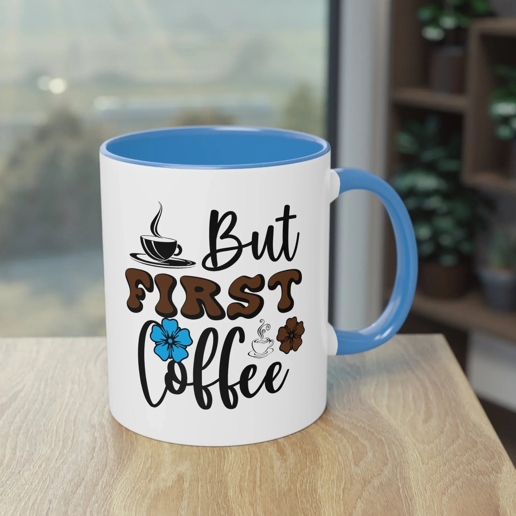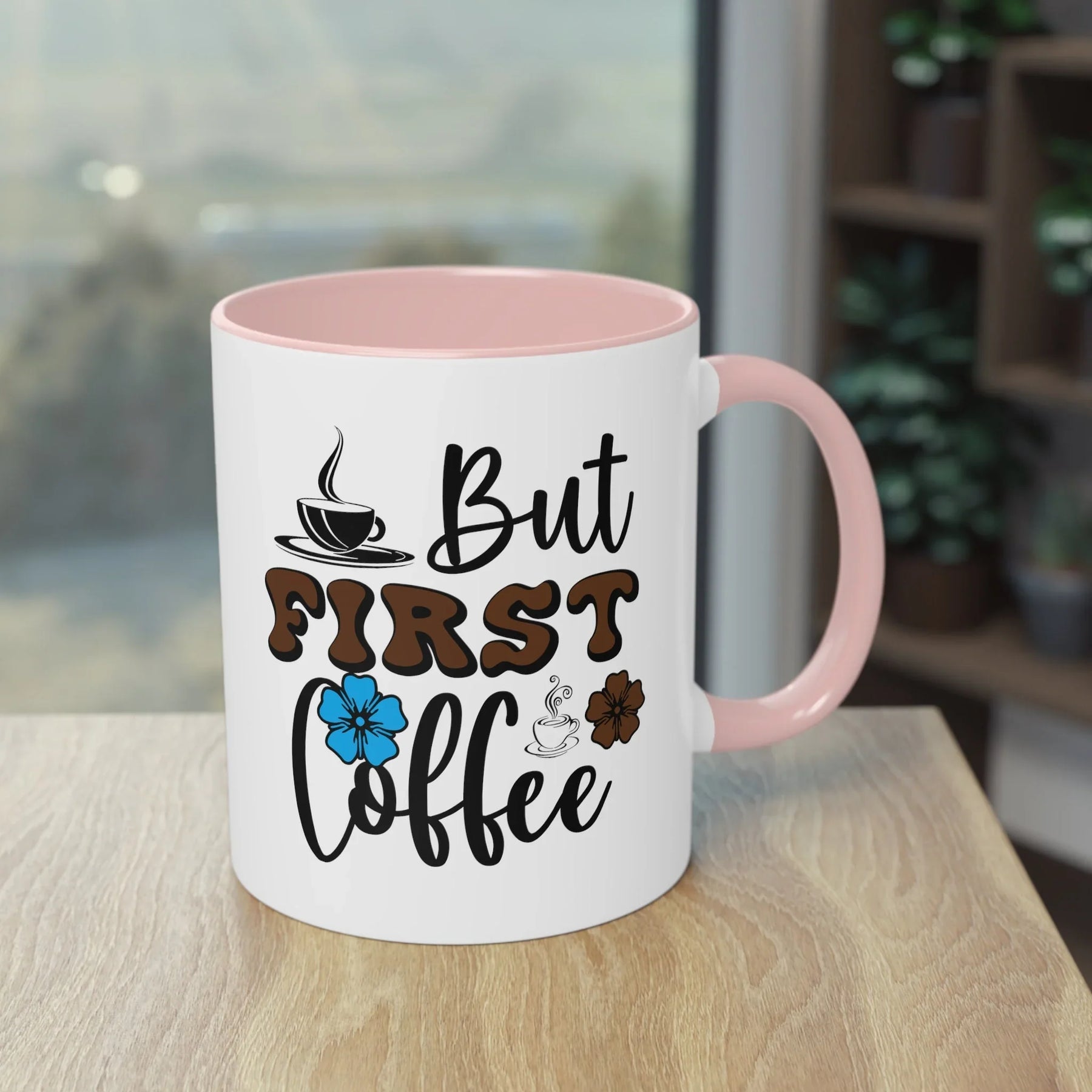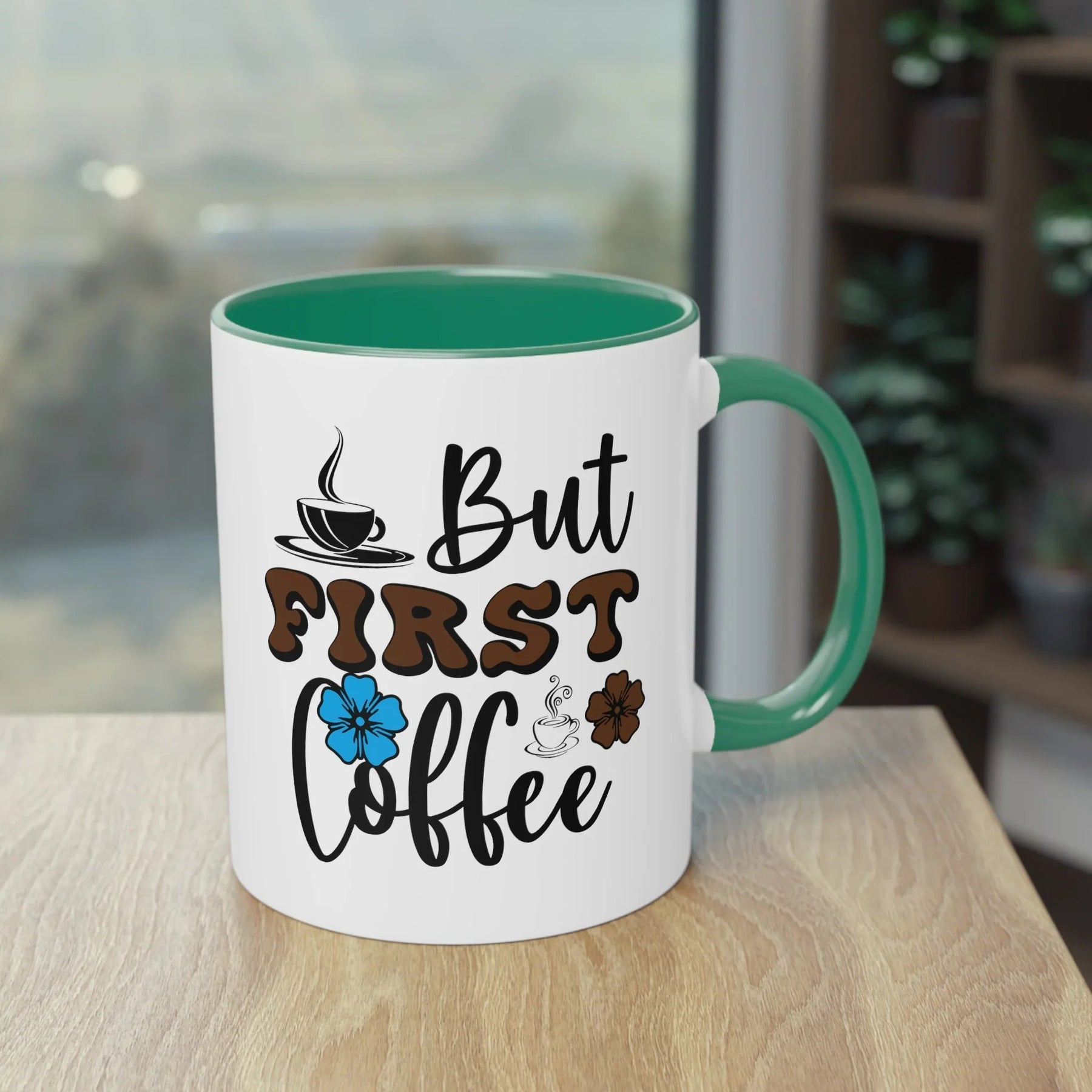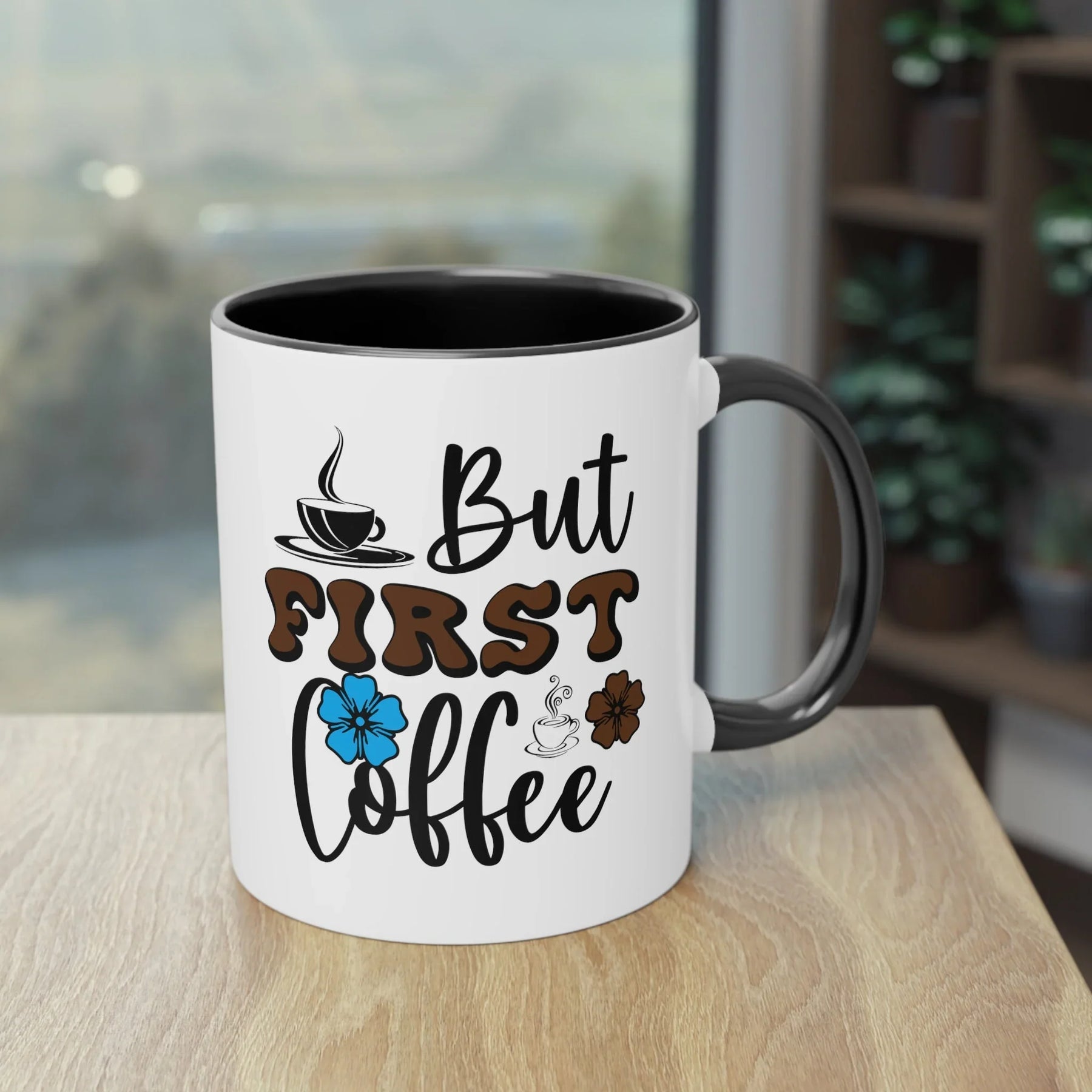 Design: "But First Coffee" Schriftzug mit bunten Blumen und Kaffeetassen